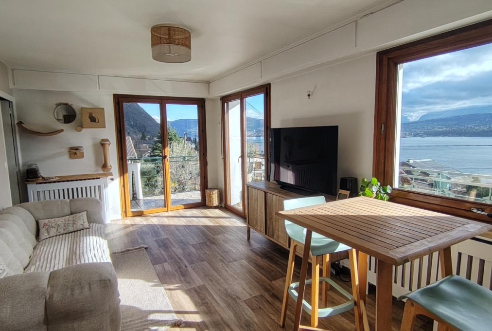 Sur la commune de Bourdeau, maison mitoyenne composée, à l’étage, d’une cuisine séparée, d’un séjour, de deux chambres, d’une salle d’eau et d’un WC indépendant. Balcon filant avec vue imprenable sur le lac et les montagnes.