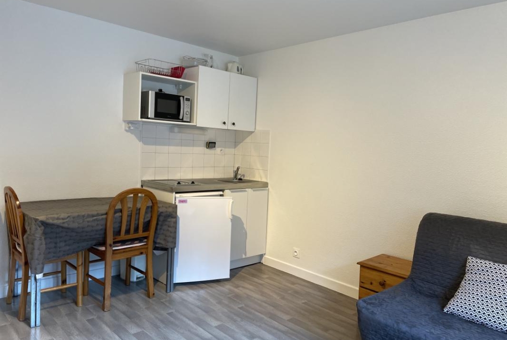 Dans une résidence sécurisée, un studio meublé composé d’une pièce de vie avec cuisine équipée et aménagée, d’une salle d’eau avec WC.