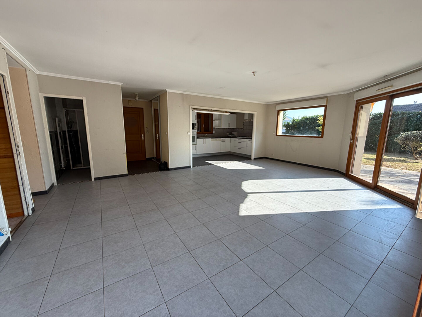 Au niveau principal, vous découvrirez une entrée avec placard, une grande pièce de vie lumineuse de 45 m² réunissant séjour et cuisine ouvrant sur une grande terrasse, ainsi qu’une salle d’eau.