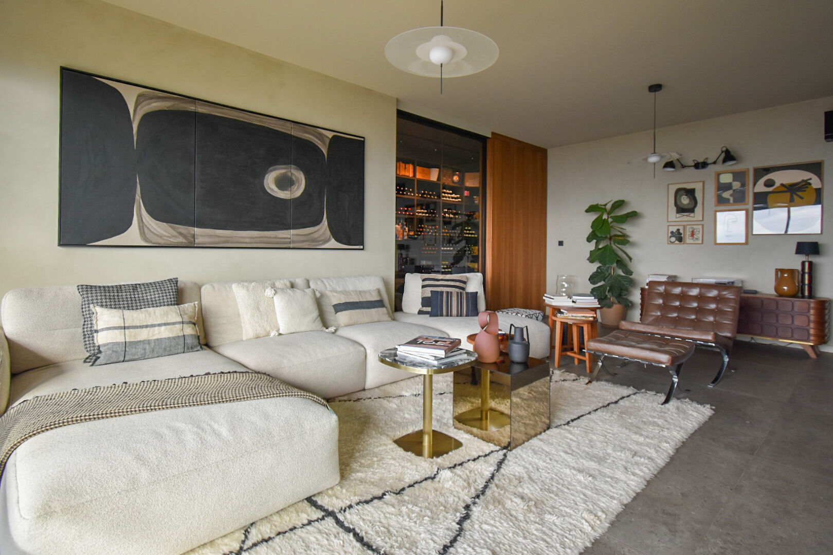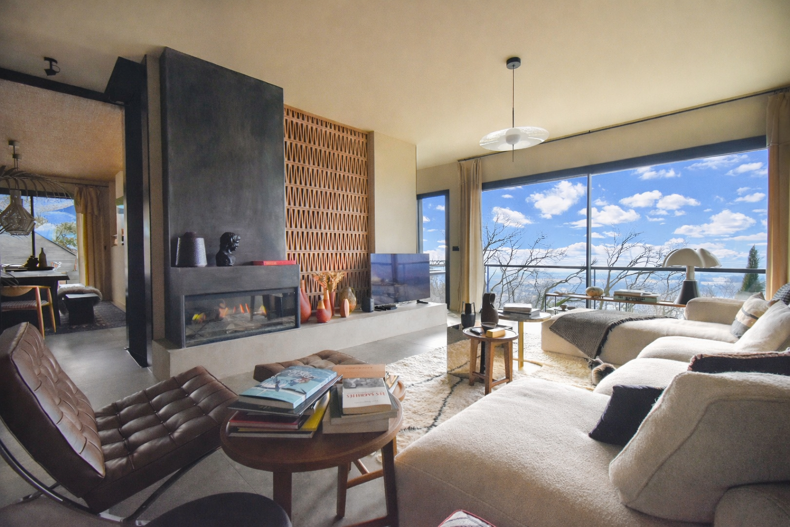Le salon, habillé d’un mur en briques et réchauffé par une cheminée électrique, offre une atmosphère à la fois contemporaine et chaleureuse. Une cave à vin aménagée vient parfaire cet espace.