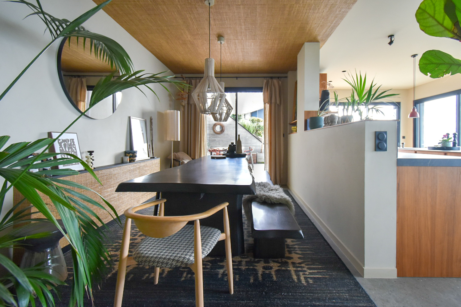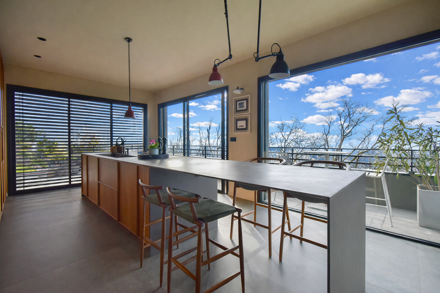 L’espace de vie principal, baigné de lumière, révèle une cuisine en noyer avec un plan de travail en céramique, ouverte sur une élégante salle à manger prolongée par une terrasse conviviale avec espace repas et barbecue.
