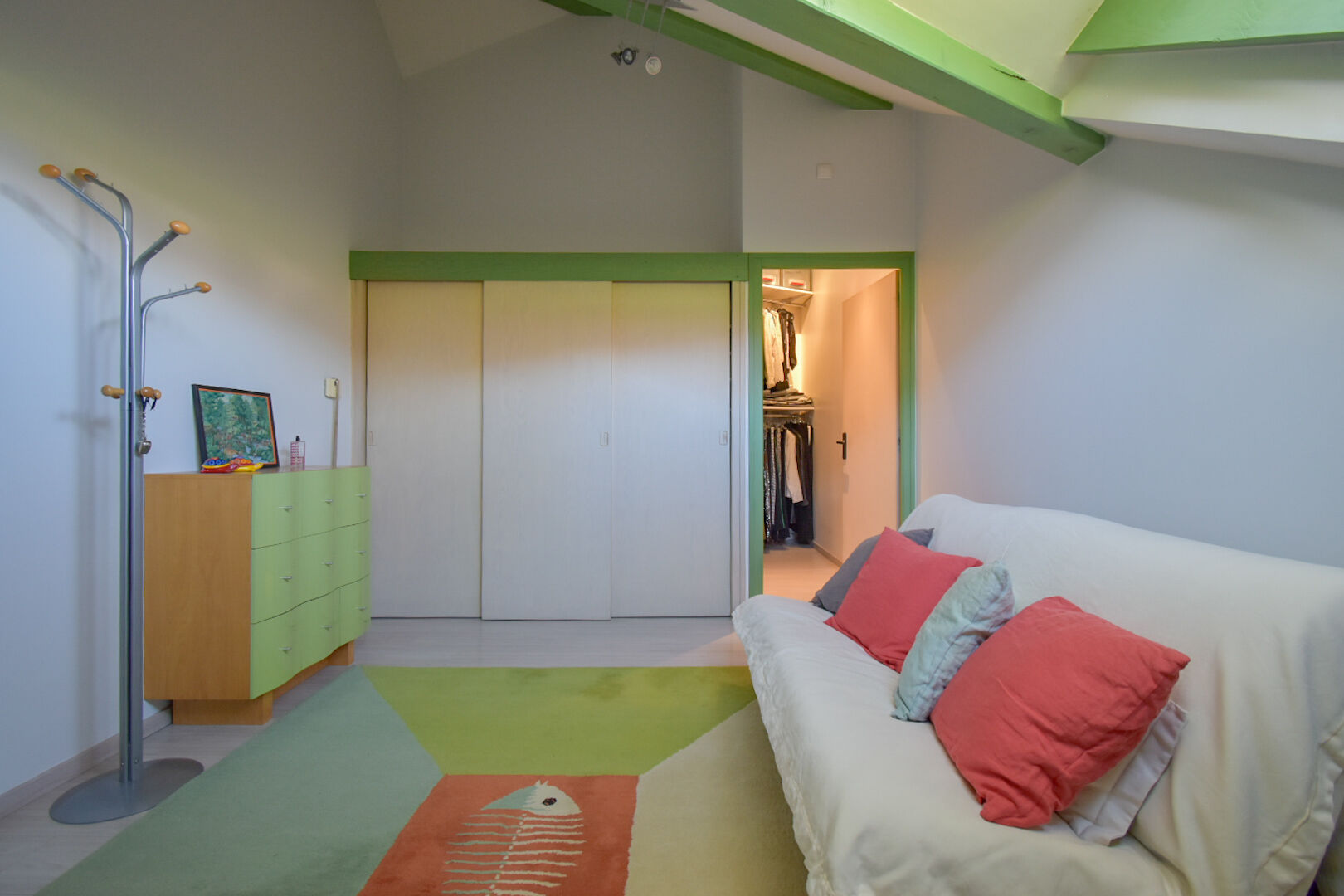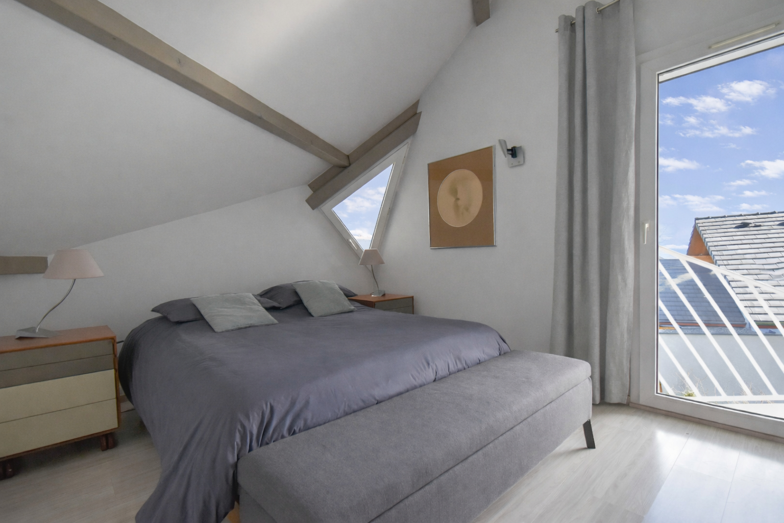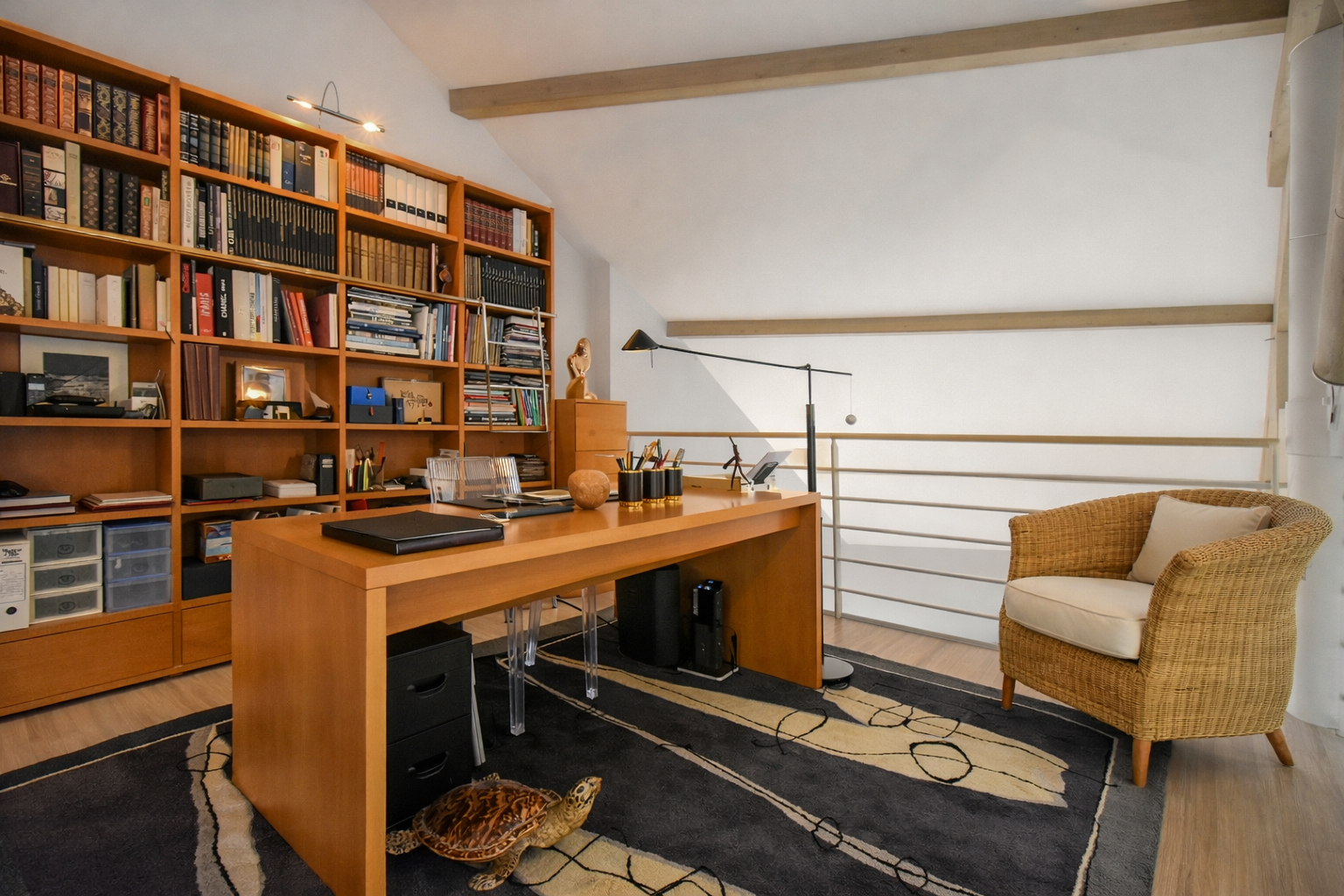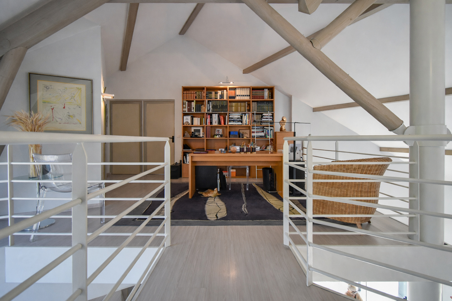 A l’étage, une mezzanine pouvant faire office de bureau ou d’espace détente dessert trois chambres dont une avec un dressing, et une salle de bains avec WC.