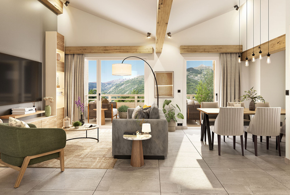 T3 séjour Plafond cathédrale sous charpente exposé Ouest agrémenté d’une terrasse vue dégagée de 11m², une cave, SEEZ à 5′ de BOURG St MAURICE Résidence Les PERSEIDES 12 logements dans un quartier résidentiel. Normes de performances thermiques acoustiques et environnementales 2020. Pompe à chaleur individuelle et thermostats, Chauffage au sol, Brises soleil orientables motorisés. Jardins potagers, Appartement livré sans cuisine. Garage en sus Plans et notices techniques détaillées disponibles dans notre agence de Bourg Saint Maurice